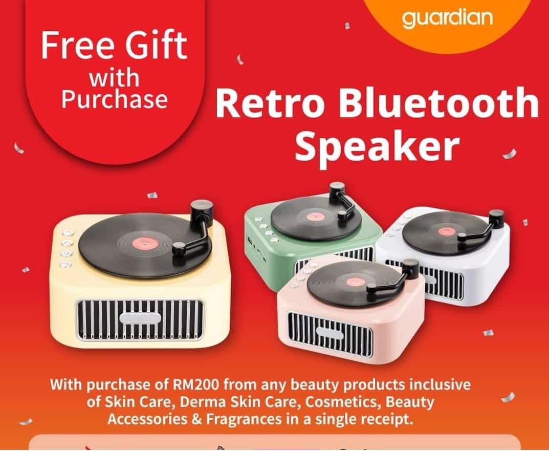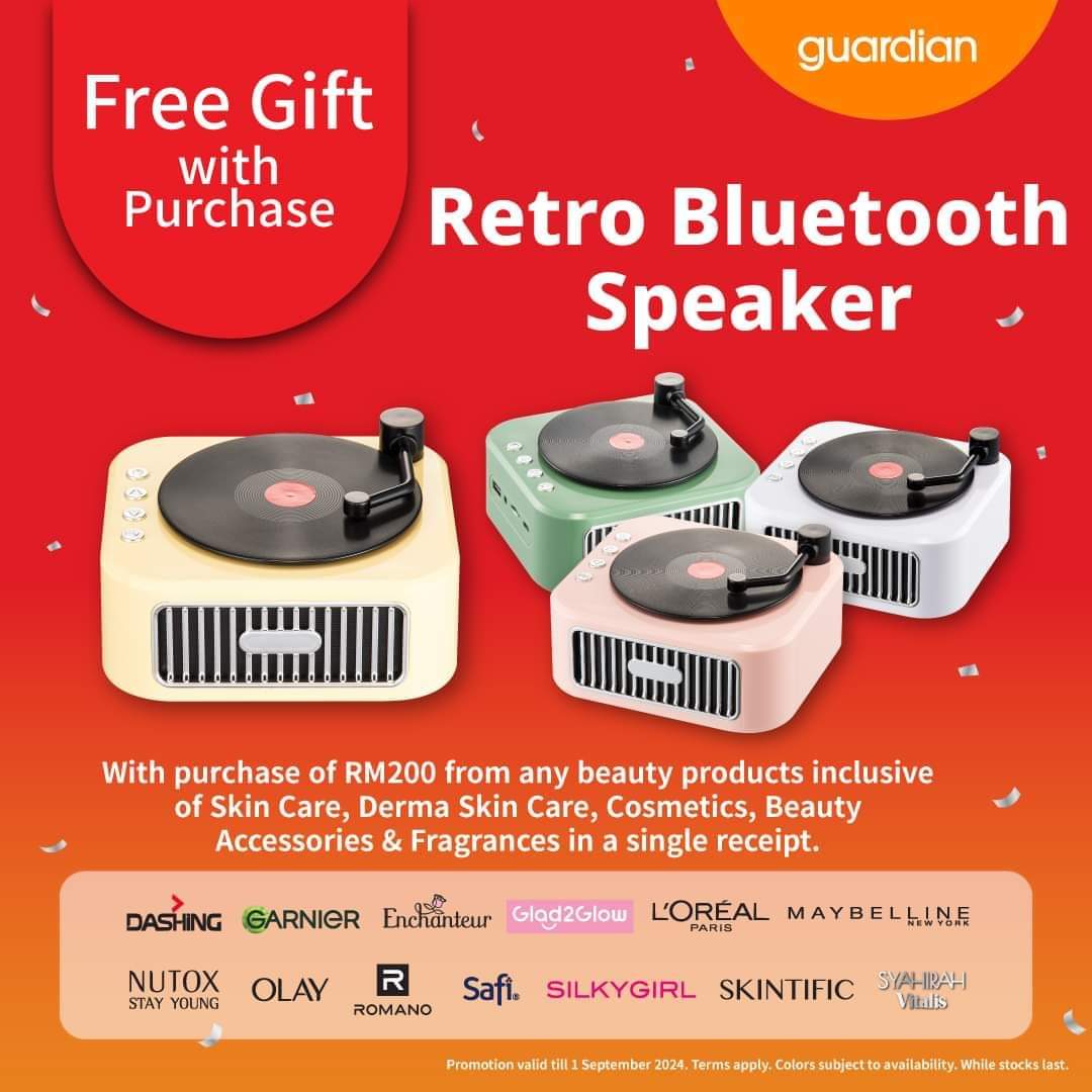 Free Retro Bluetooth Speaker with purchase of RM200.00 from any beauty products inclusive Skin Care, Derma Skin Care, Cosmetics, Beauty Accessories & Fragrances in a single receipt.Check out skin care products & free gifts with the helpful retailers at Guardian, Endah Parade. (Gifts are while stock last which subject to fulfilling the above mentioned criteria)