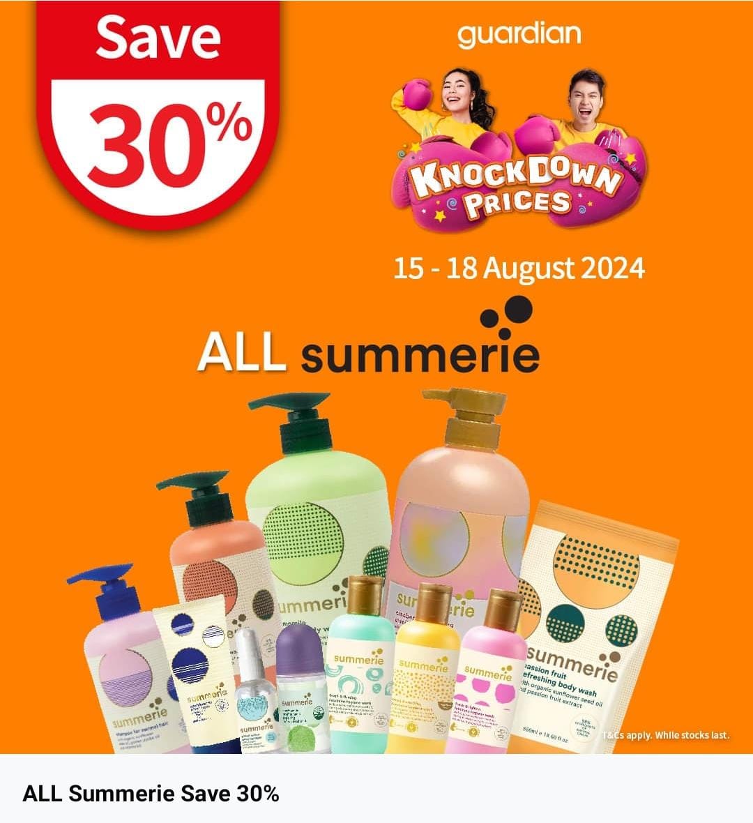 You can enjoy a knockdown price of 30% for all Summerie products at Guardian, Endah Parade on this weekend (15 - 18/8/2024)